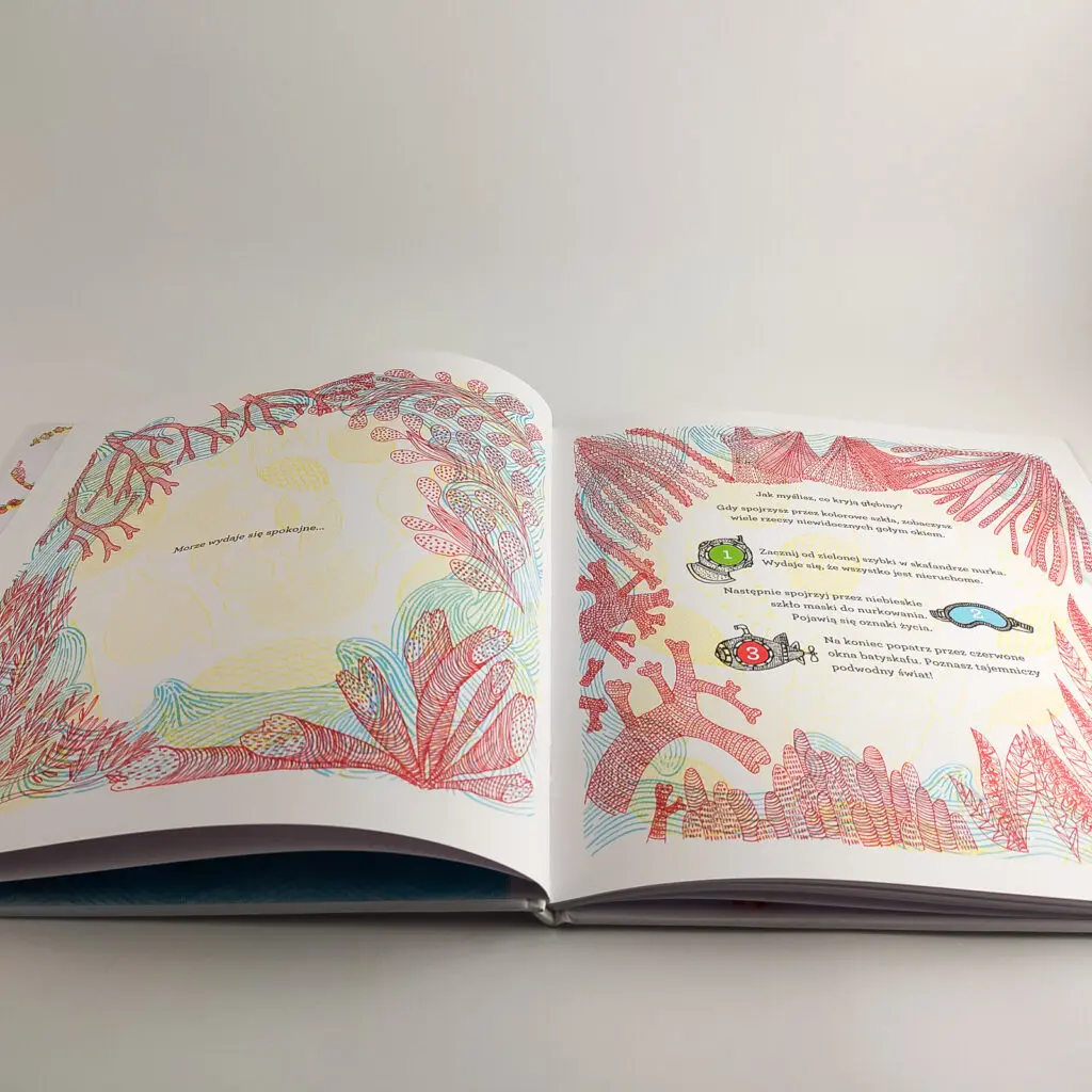 Aina Bestard i jej interaktywne książki “Co kryje las?”, “Co kryje morze?”, “Co kryje ciało?” pozwalają dziecku samodzielnie odkrywać niewidziane gołym okiem – bogatą leśną przyrodę, tajemnicze podwodne głębiny oraz fascynujące wnętrze ludzkiego organizmu. Oszczędnie malowany świat przedstawiony, miejscami estetyką bliski raczej bajecznym i nierzeczywistym krainom – dzięki wielowarstwowym ilustracjom oraz przeźroczom (szkiełkom) w trzech kolorach dołączonym do każdej książki – nabiera realnych, ale nie mniej fascynujących (wręcz przeciwnie) kształtów i kolorów. Interaktywne eksplorowanie tych książek to suma wielu aktywności – patrzenia, szukania, odkrywania, podziwiania, ale i czytania, które w tym wypadku pełni instruktażową rolę względem kolorowych filtrów, później dopiero inspirując do odkrywania ukrytych tajemnic prezentowanych światów.