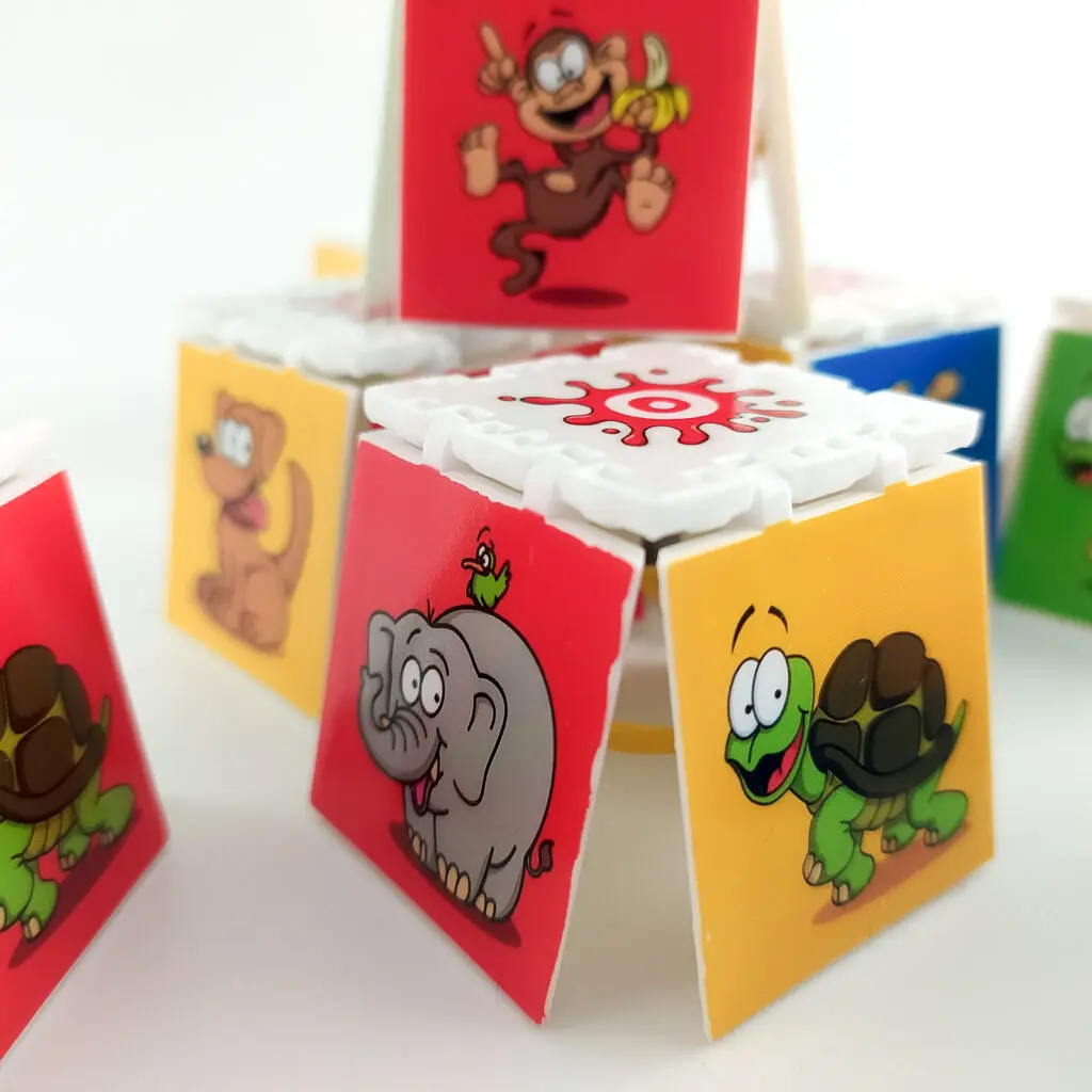 - jedno zwierzę na kolorowym tle – gracze szukają więc kostki z identycznym zwierzęciem przedstawionym na takim samym tle jak na karcie,