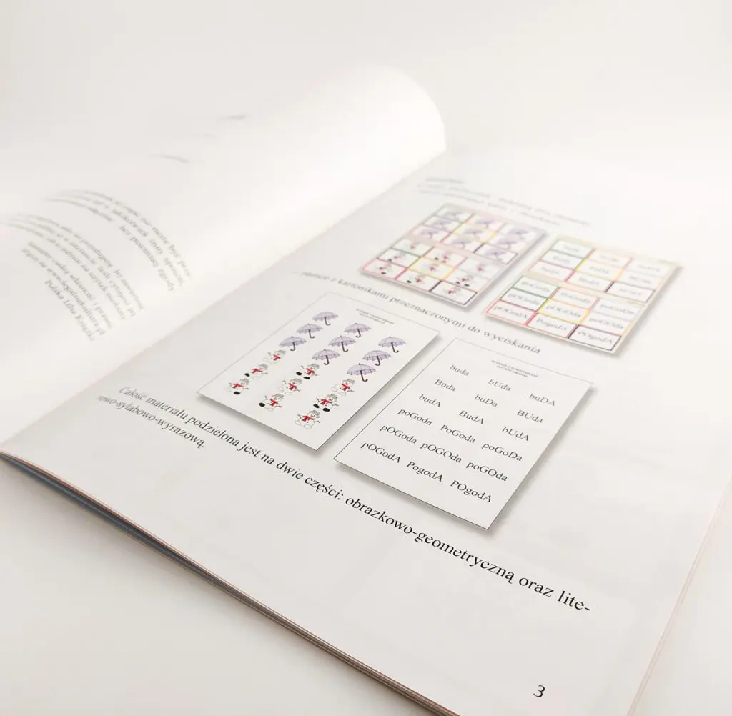 - zeszyt zawierający krótką instrukcję do zestawu oraz karty z obrazkami, do których dokłada się odpowiednie kartoniki,