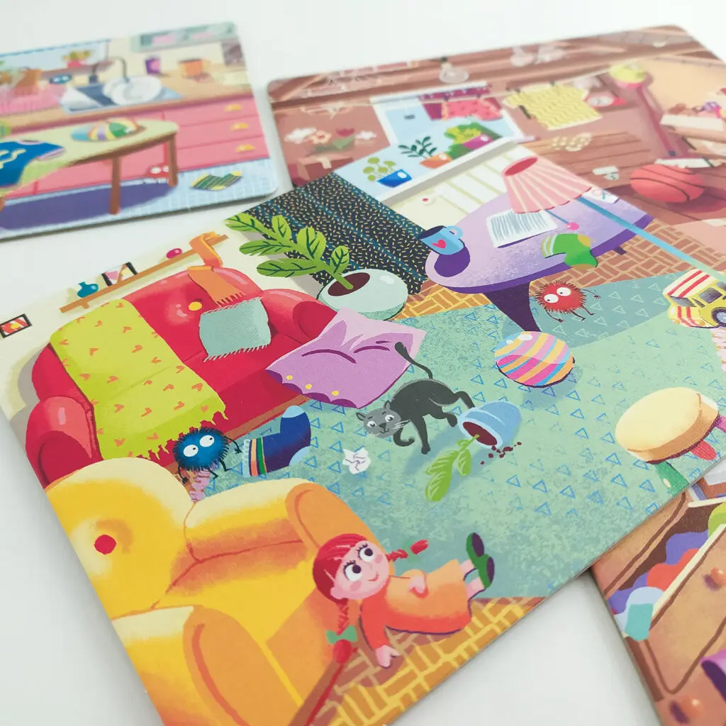 - 4 dwustronne tekturowe plansze – awersy przedstawiają szafki z 5 przedmiotami, rewersy pomieszczenia (salon, kuchnię, pokoje dziecięce),