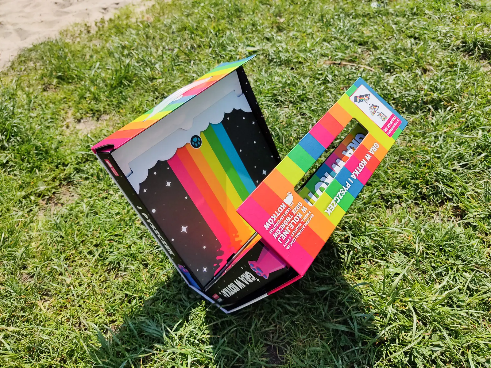 “Gra w kotka i w pyszczek” mieści się w dużym, jak się okazuje wielofunkcyjnym pudełku, który imituje walizkę (poprzez posiadany uchwyt). Mieszczą się w niej wszystkie elementy gry. Poręczne opakowanie idealnie nadaje się, by grę zabrać na piknik czy do znajomych.