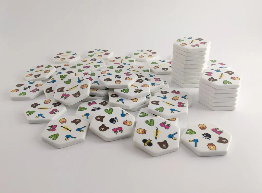 W skład gry wchodzą 52 sześciokątne płytki. Imitujące plastry miodu kafelki wykonane zostały z bardzo solidnego plastiku. Każda ściana płytki oznaczona jest symbolem kojarzącym się z pszczołami, miodem i pszczelarstwem. Nie ma dwóch takich samych płytek.