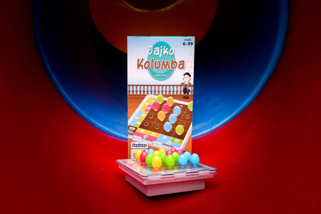“Jajko Kolumba” to jednoosobowy pojedynek logiczny. Plansza wraz z potrzebnymi elementami gry mieści się w poręcznym pudełku, dzięki czemu kompaktowo zapakowaną łamigłówkę można zabierać w podróż, w plener lub gdzie tylko znajdziemy chwilę czasu, by spróbować swoich sił w umysłowych wyzwaniach. Ale uwaga, ustawianie kolorowych jajek na odpowiednich miejscach w rzędach i kolumnach plastikowej planszy, nie przypomina zwykłego układania jajek w wytłaczankach podczas zakupów. Tutaj rządzą reguły i królują kolory.