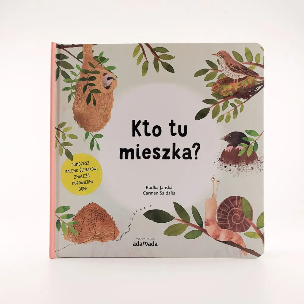 W “Kto tu mieszka?” czytelnik wyruszając z młodym i nieświadomym swojej niezwykłości ślimakiem (swój upragniony dom przecież ma na sobie) w podróż trwającą cały dzień w poszukiwaniu własnego domu, poznaje wiele schronień różnych gatunków zwierząt.