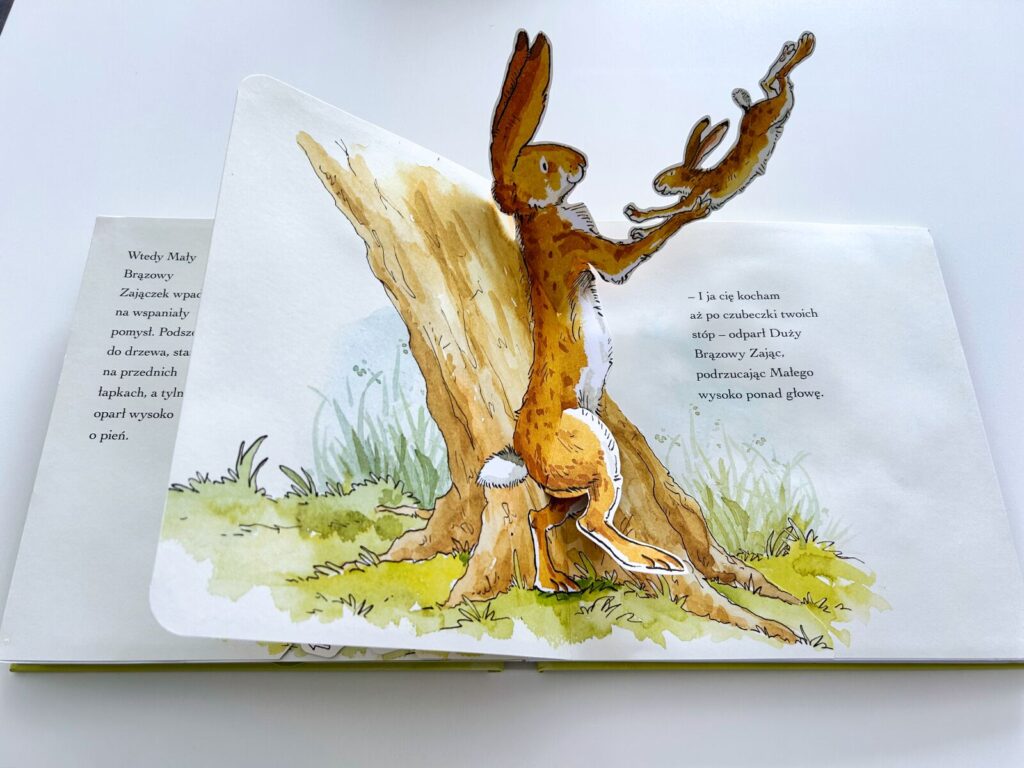 Książka zachowuje oryginalny tekst, ale każda scena zyskuje nową głębię dzięki precyzyjnie zaprojektowanym elementom pop-up. Gdy Mały Zajączek rozkłada ramiona, by pokazać swoją miłość, czytelnik może dosłownie zobaczyć ten gest w przestrzeni. Kiedy Duży Zając podrzuca Małego wysoko w górę – kartonowa konstrukcja odtwarza ten moment z zadziwiającą precyzją.